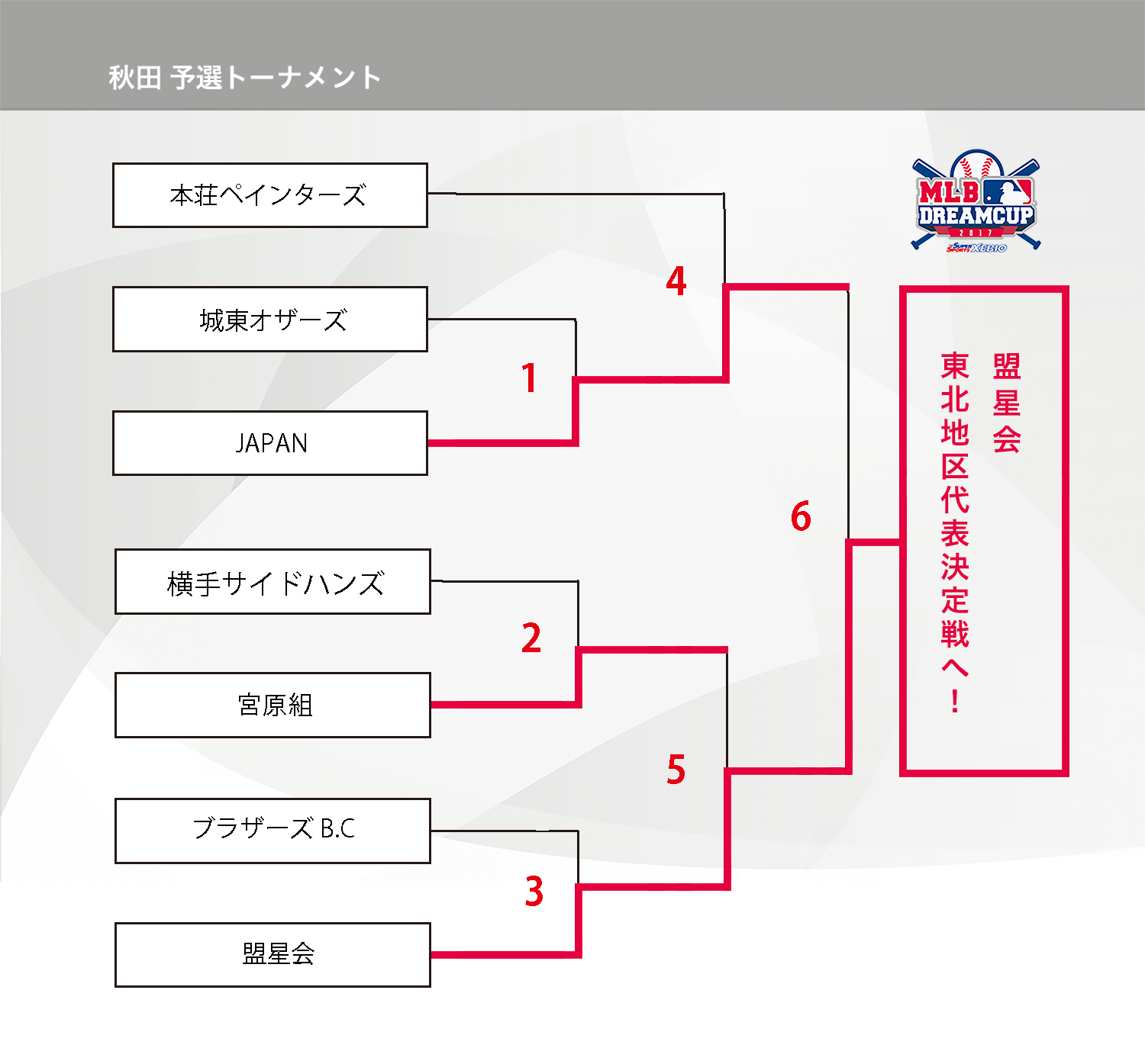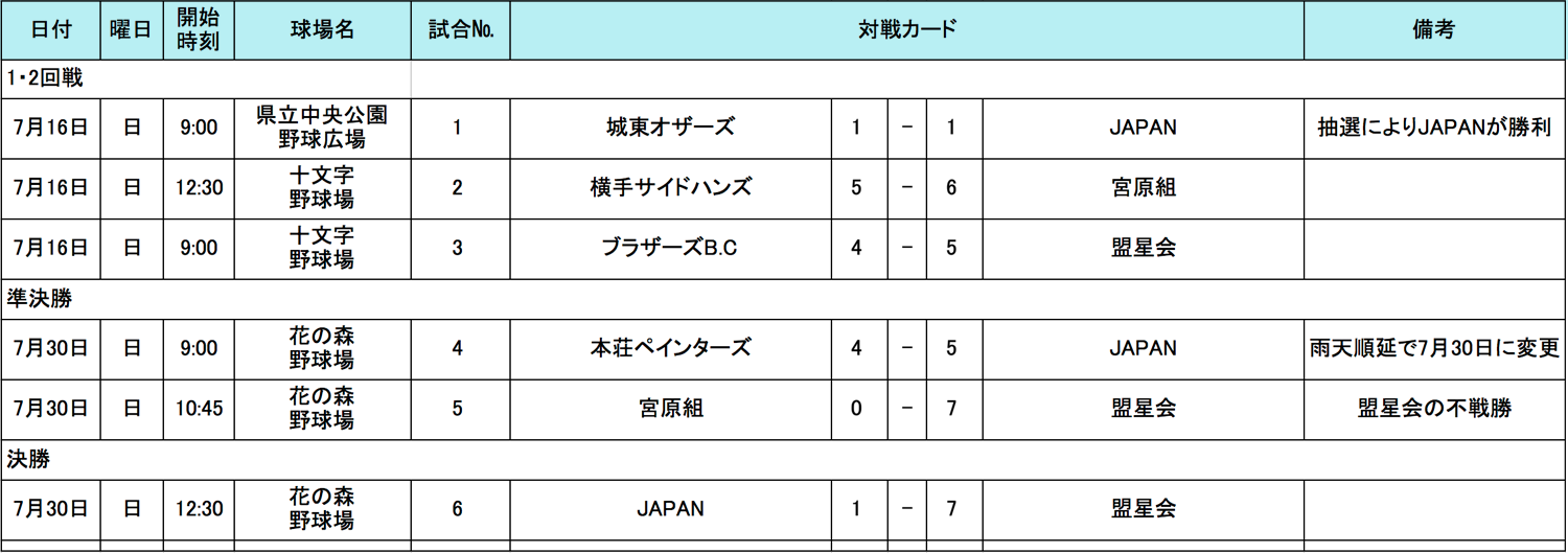 秋田県の参加者の皆様大変お待たせいたしました、秋田ブロックのトーナメント表をアップいたしました。後期日程待ちを以って、ブロック代表が決定いたしましたのでお知らせいたします。7月30日(日)の「盟星会」VS「JAPAN」の結果、7-1で「盟星会」が東北地区代表決定戦に進出することとなっております。「JAPAN」チームも健闘でお疲れ様でした、また来年もお待ちしております!