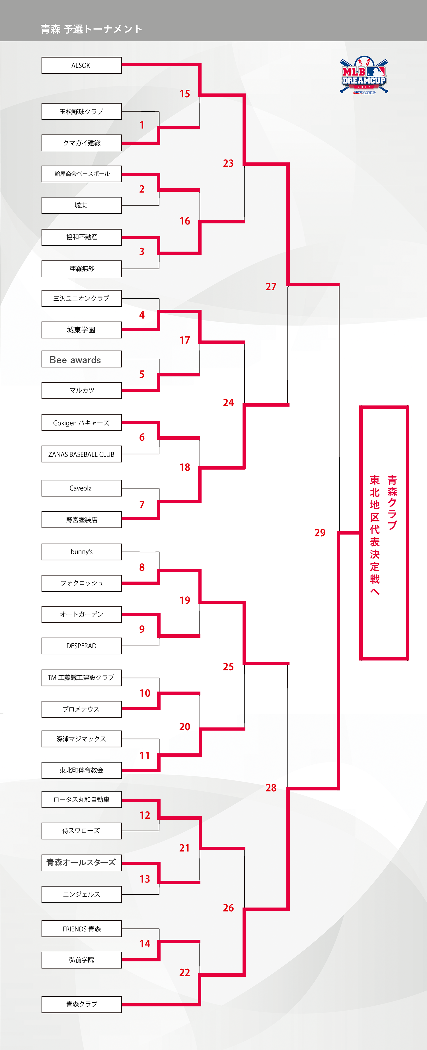 HOME > アーカイブ > アーカイブ 東北地区 試合結果(予選) 青森ブロック・試合結果 2017年10月4日 青森県の参加者の皆様、大変お待たせいたしました。10月1日(日)の準決勝〜決勝の結果をお知らせ致します。 「ALSOK」VS「野宮塗装店」2-0 「青森クラブ」VS「フォクロッシュ」6-0 よって決勝は「ALSOK」VS「青森クラブ」で行われ、見事6-9で「青森クラブ」が東北代表決定戦に進むことになりました!「ALSOK」も東北激戦区にて大健闘でお疲れ様でした、また来年もお待ちしております。 試合結果表を拡大 東北地区の詳細の日程はこちら note -アーカイブ, 東北地区, 試合結果(予選)