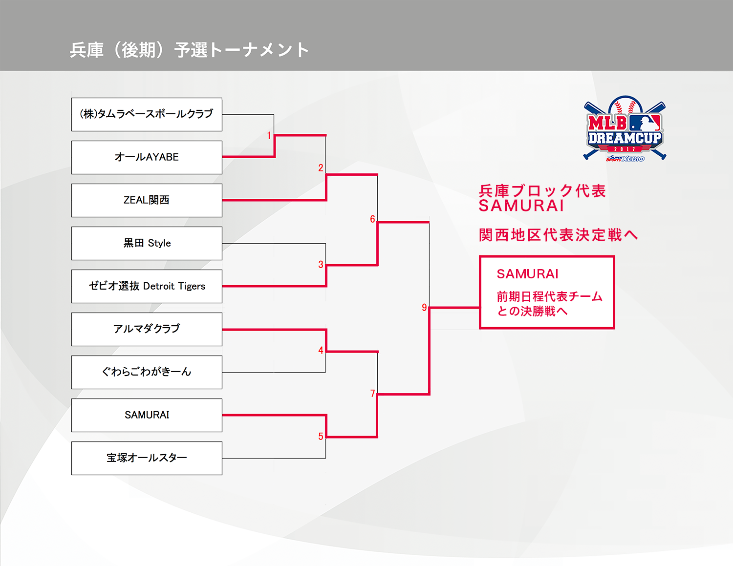 HOME > アーカイブ > アーカイブ 試合結果(予選) 関西地区 兵庫ブロック(後期)・日程更新 2017年9月28日 兵庫県の参加者の皆様、大変お待たせ致しました。 9月24日(日)に兵庫ブロックの決勝が行われましたので、結果をお知らせいたします。「SAMURAI」VS 前期優勝「神戸西ベースボールクラブ」との対戦となり、3-0でSAMURAIチームが関西地区代表決定戦に進むこととなりました。おめでとうございます!「神戸西ベースボールクラブ」も大健闘でお疲れ様でした。来年もおまちしております! 試合結果表を拡大 関西地区の詳細の日程はこちら note -アーカイブ, 試合結果(予選), 関西地区