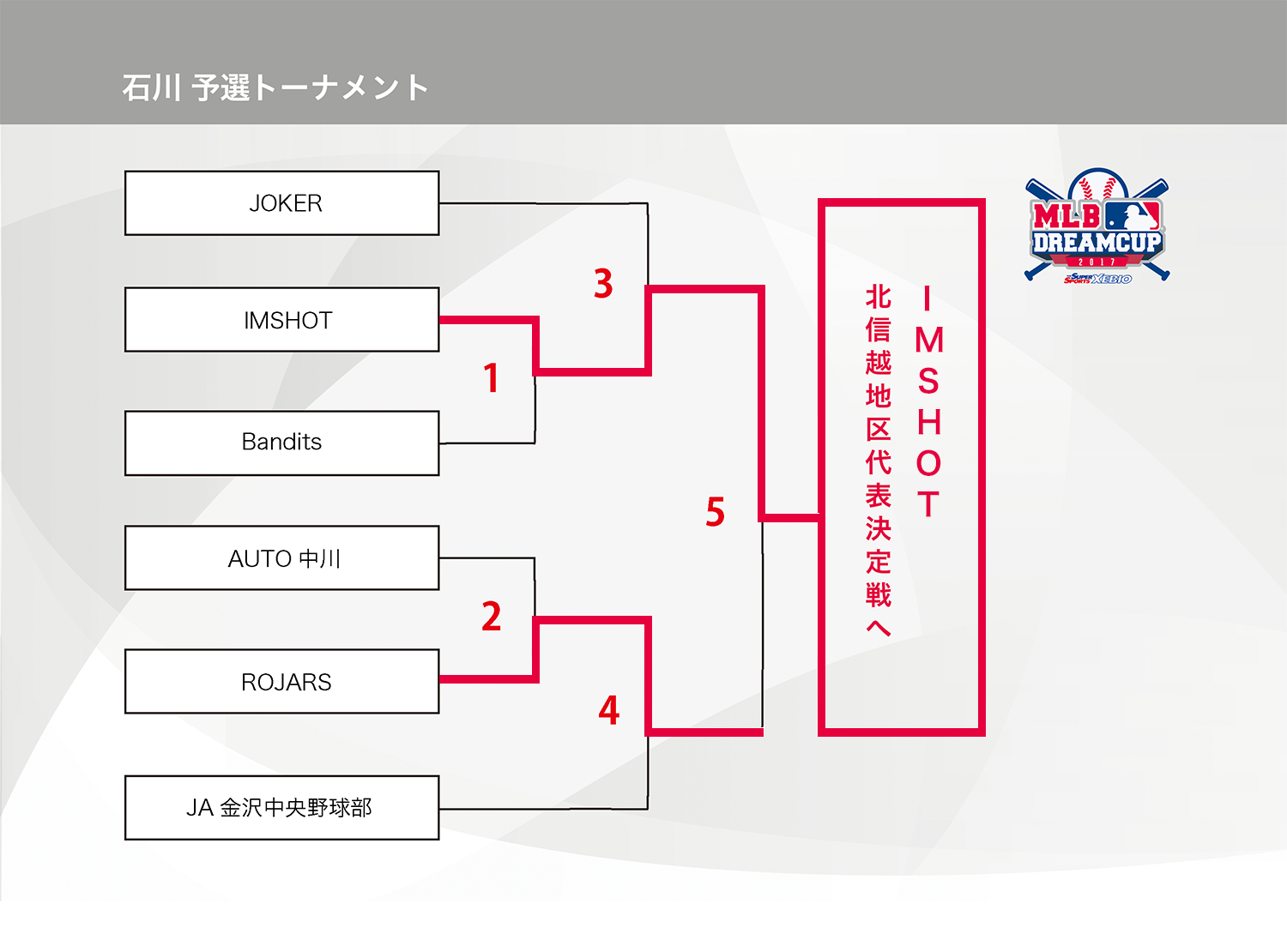 HOME > アーカイブ > アーカイブ 北信越地区 試合結果(予選) 石川ブロック・試合結果 2017年10月10日 石川県の参加者の皆様、大変お待たせ致しました。 10月8日(日)の 準決勝〜決勝の結果をアップ致しました。トーナメント戦の結果、石川ブロックは「IMSHOT」チームが代表に決定しました!準優勝の「ROJARS」チームも健闘をいただき有り難うございました、また来年もお待ちしております。 試合表を拡大 北信越地区の日程はこちら note -アーカイブ, 北信越地区, 試合結果(予選)