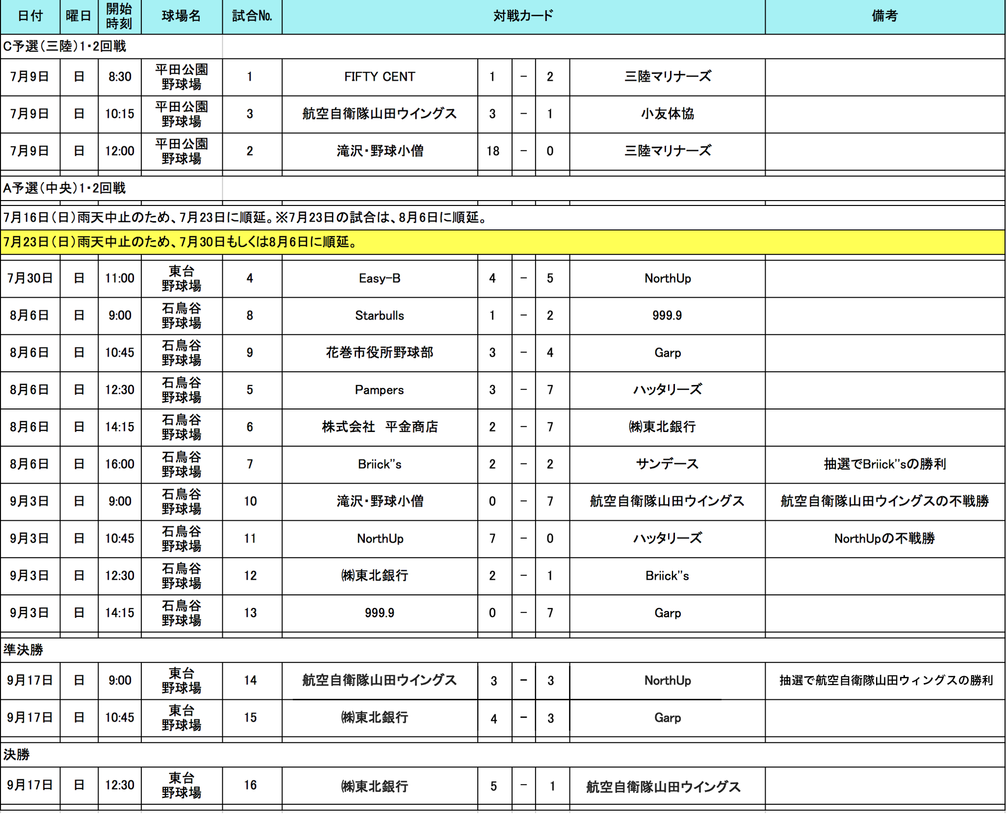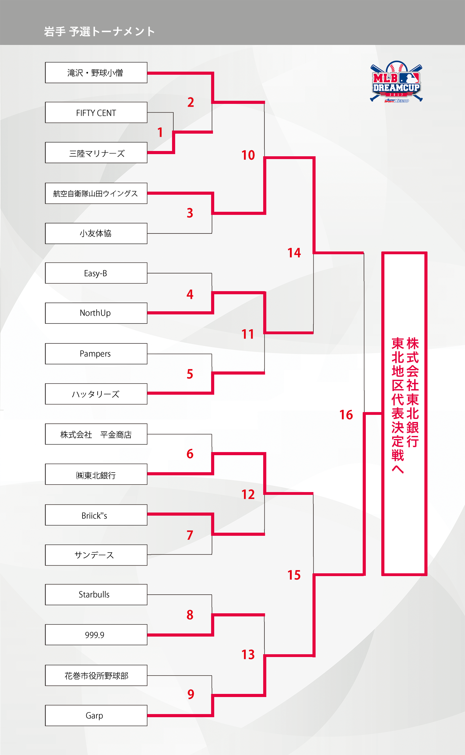 岩手県の参加者の皆様、大変お待たせ致しました。9月17日(日)に準決勝〜決勝が行われましたので、結果をお知らせいたします。「航空自衛隊山田ウィングス」VS「(株)東北銀行」にて、決勝が行われ、1-5で(株)東北銀行が東北地区代表決定戦に進むこととなりました、おめでとうございます!航空自衛隊山田ウィングスには健闘をいただき、お疲れ様でした、また来年もおまちしております。