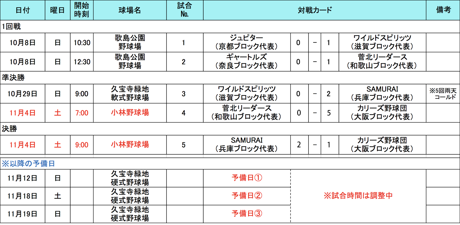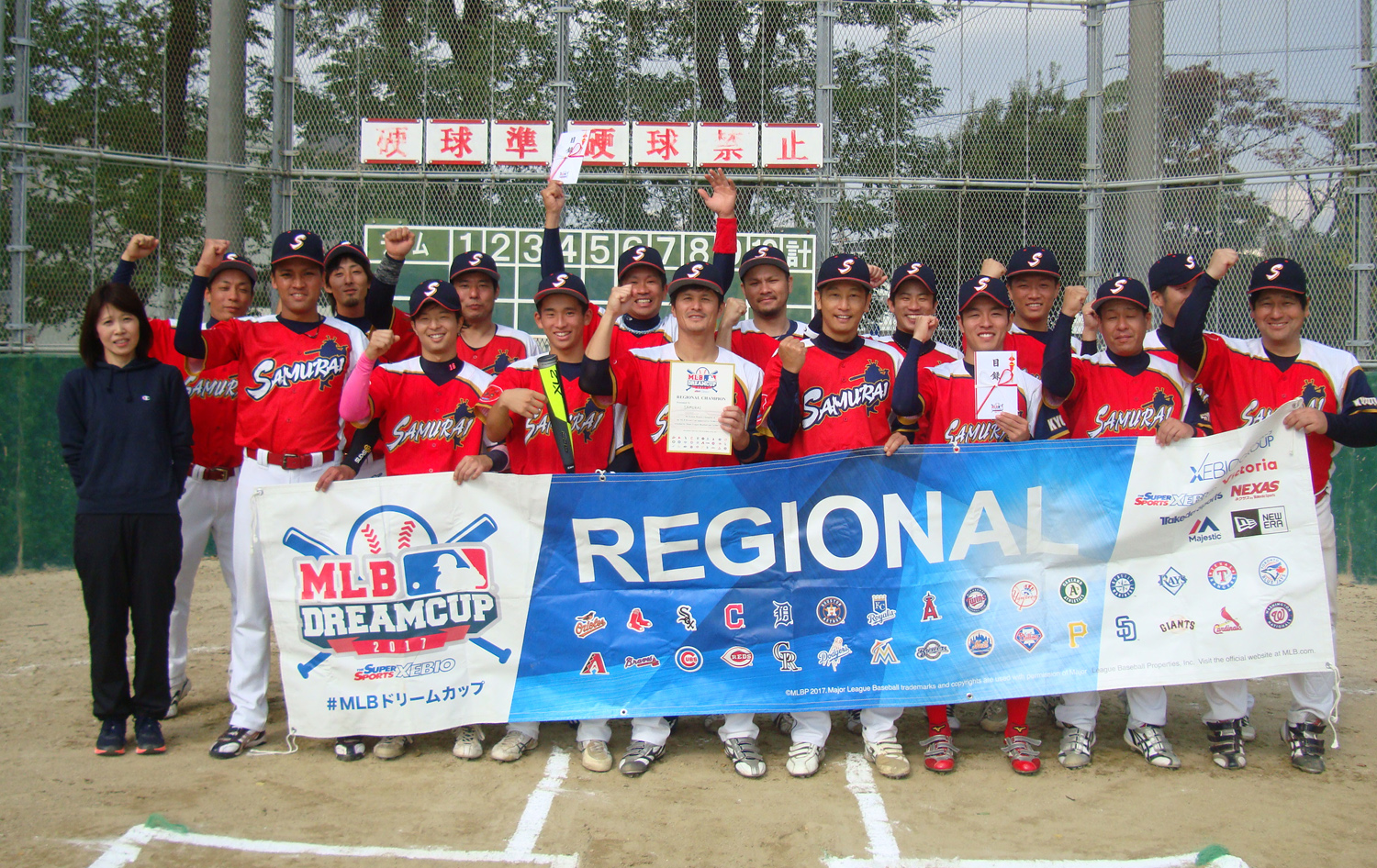 11月4日(土)に関西地区代表決定戦が行われました。和歌山・菅北リーダース VS 大阪・カリーズ野球団戦の結果、決勝戦は大阪・カリーズ野球団 VS 兵庫・ SAMURAIで行われました。全国決勝大会開催地の沖縄へのJTB旅行券100万円とBoston Red SoxのMLBマジェスティックユニフォームを手にしたのは兵庫代表「SAMURAI」となりました、おめでとうございます!