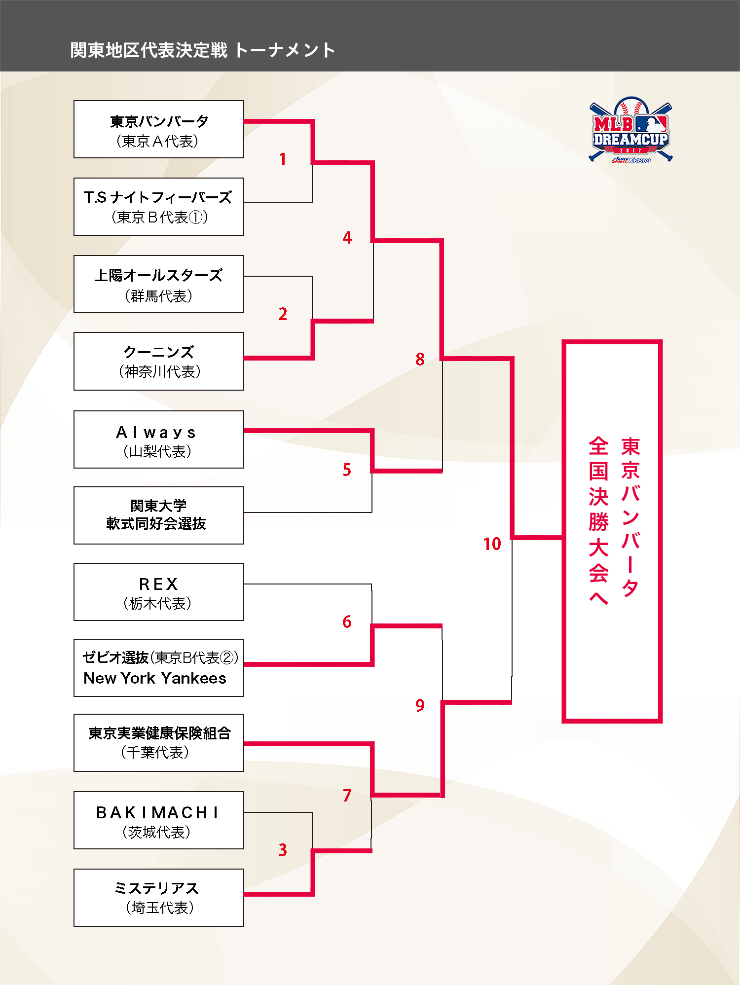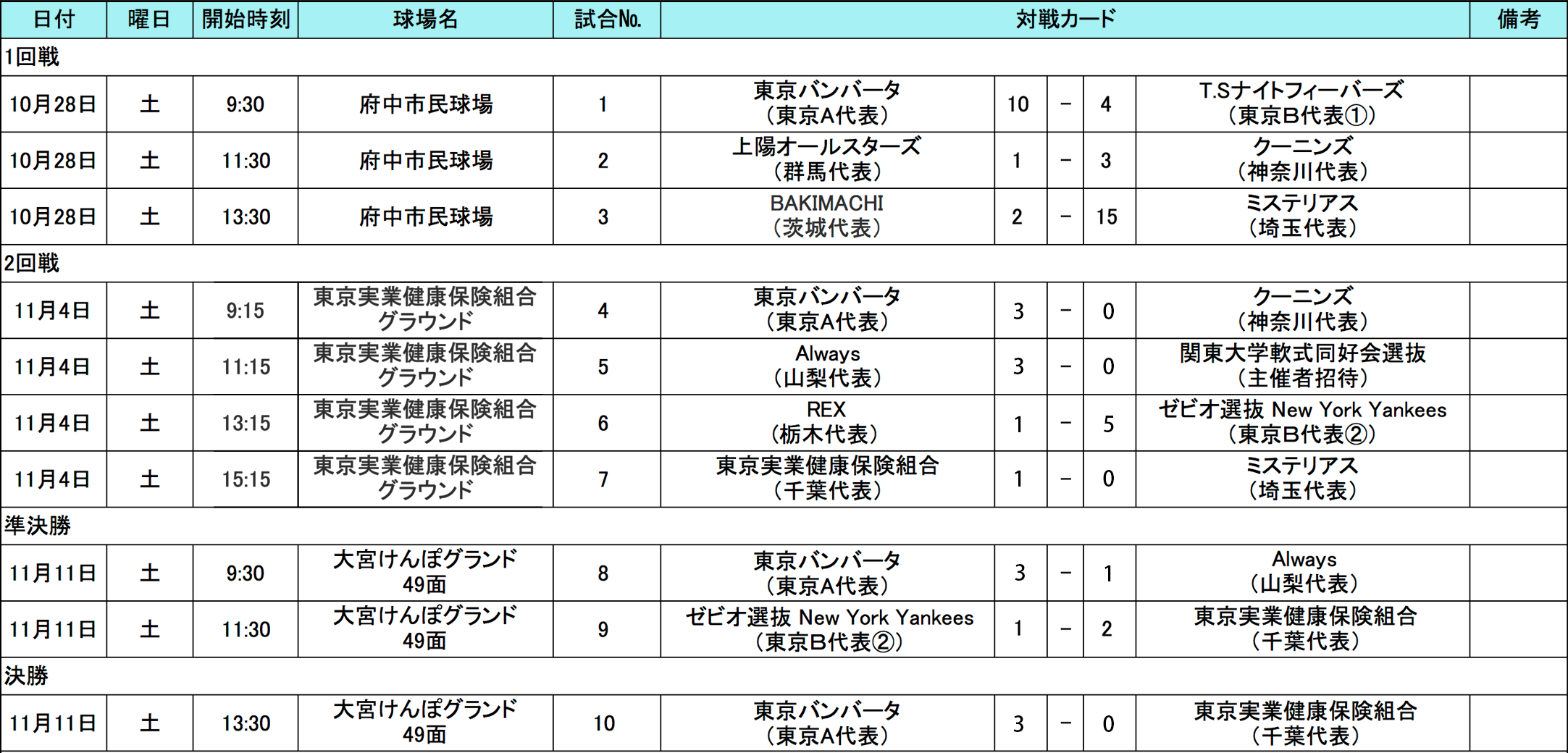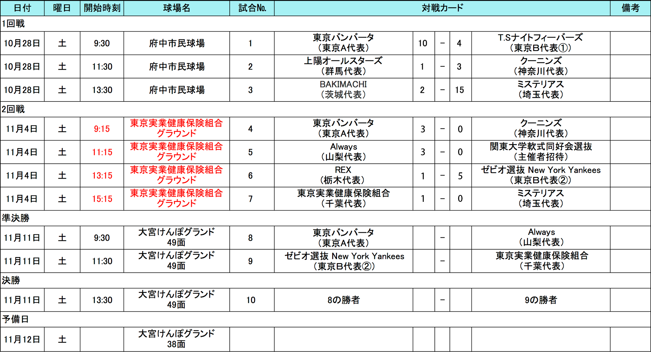 11月11日(土)に関東地区代表決定戦、準決勝〜決勝が行われました。準決勝戦の結果、決勝戦は東京A・東京バンバータ VS 千葉・ 東京実業健康保険組合で行われ、全国決勝大会開催地の沖縄へのJTB旅行券100万円とChicago CubsのMLBマジェスティックユニフォームを手にしたのは東京A代表「東京バンバータ」となりました。初の2年連続で地区代表戦優勝チームです、おめでとうございます!