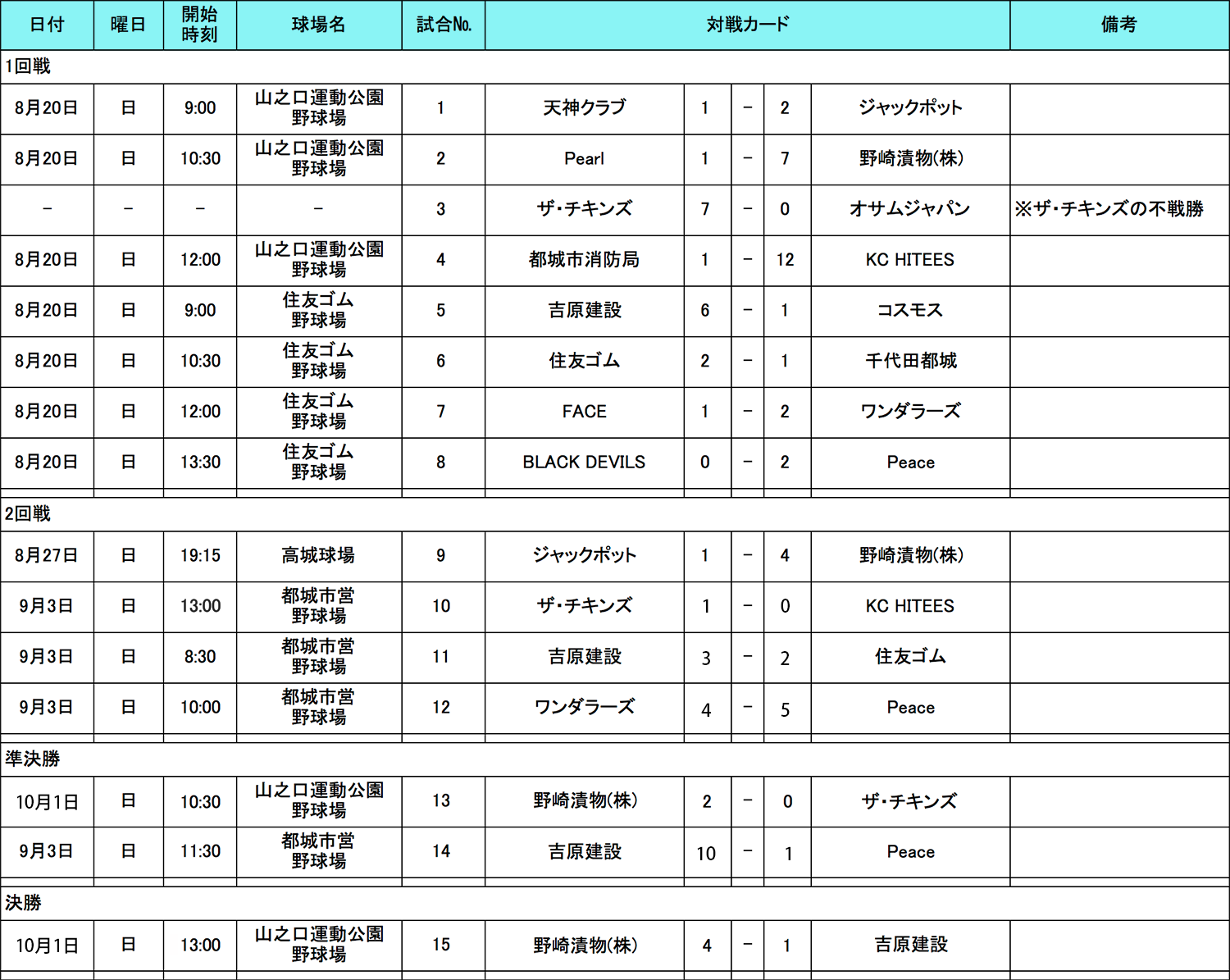HOME > アーカイブ > アーカイブ 九州・沖縄地区 試合結果(予選) 宮崎ブロック・試合結果 2017年10月4日 宮崎県の参加者の皆様、お待たせいたしました。10月1日(日)に準決勝〜決勝が行われましたので、結果をお知らせします。準決勝「野崎漬物(株)」VS「ザ・チキンズ」の結果2-0で、すでに決勝進出を決めていた「吉原建設」VS「野崎漬物(株)」で決勝戦が行われ、見事1-4で「野崎漬物(株)」が宮崎ブロック優勝を決め、九州・沖縄代表決定戦に進むこととなりました。「吉原建設」も一気に決勝まで進む進撃、大健闘でお疲れ様でした、また来年もお待ちしております! 試合表を拡大 九州・沖縄地区の詳細日程はこちら note -アーカイブ, 九州・沖縄地区, 試合結果(予選)