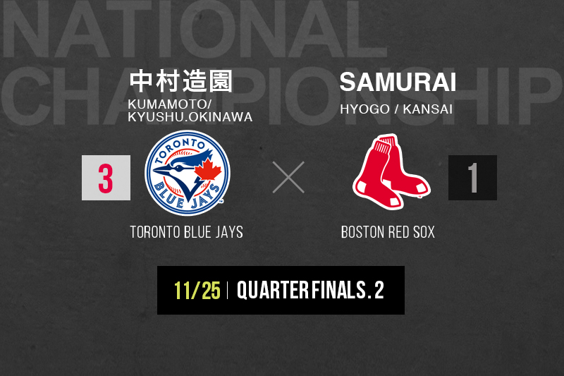 Boston Red Soxのユニフォームを着用したSAMURAIとToronto Blue Jays のユニフォームを着用した中村造園の一戦は中村造園が、5番キャッチャー椎谷の右中間を破る二塁打で幸先よく二点を先制。ゲームは動かなかったが、4回裏に9番ショート川道の遊ゴロの間に、三塁ランナーの須本がホームイン。このまま、ゲームが終了するかと思われたが、最終回におSAMURAIがチャンスを作る。9番中島がセカンドゴロを放ち、ゲッツーを狙ったセカンド西のエラーで相根がホームインし、1点を返す。2アウト満塁までチャンスを広げたが、矢野が抑えきり、完投勝利。九州・沖縄地区代表の中村造園が3-1でSAMURAIに勝利した。