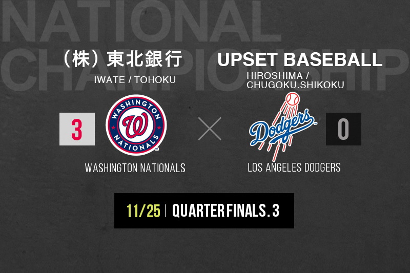 先攻はWashington Nationals のユニフォームを着用した東北地区代表(株)東北銀行と後攻Los Angeles Dodgersのユニフォームを着用した中国・四国地区代表のUPSET BASEBALLの一戦。