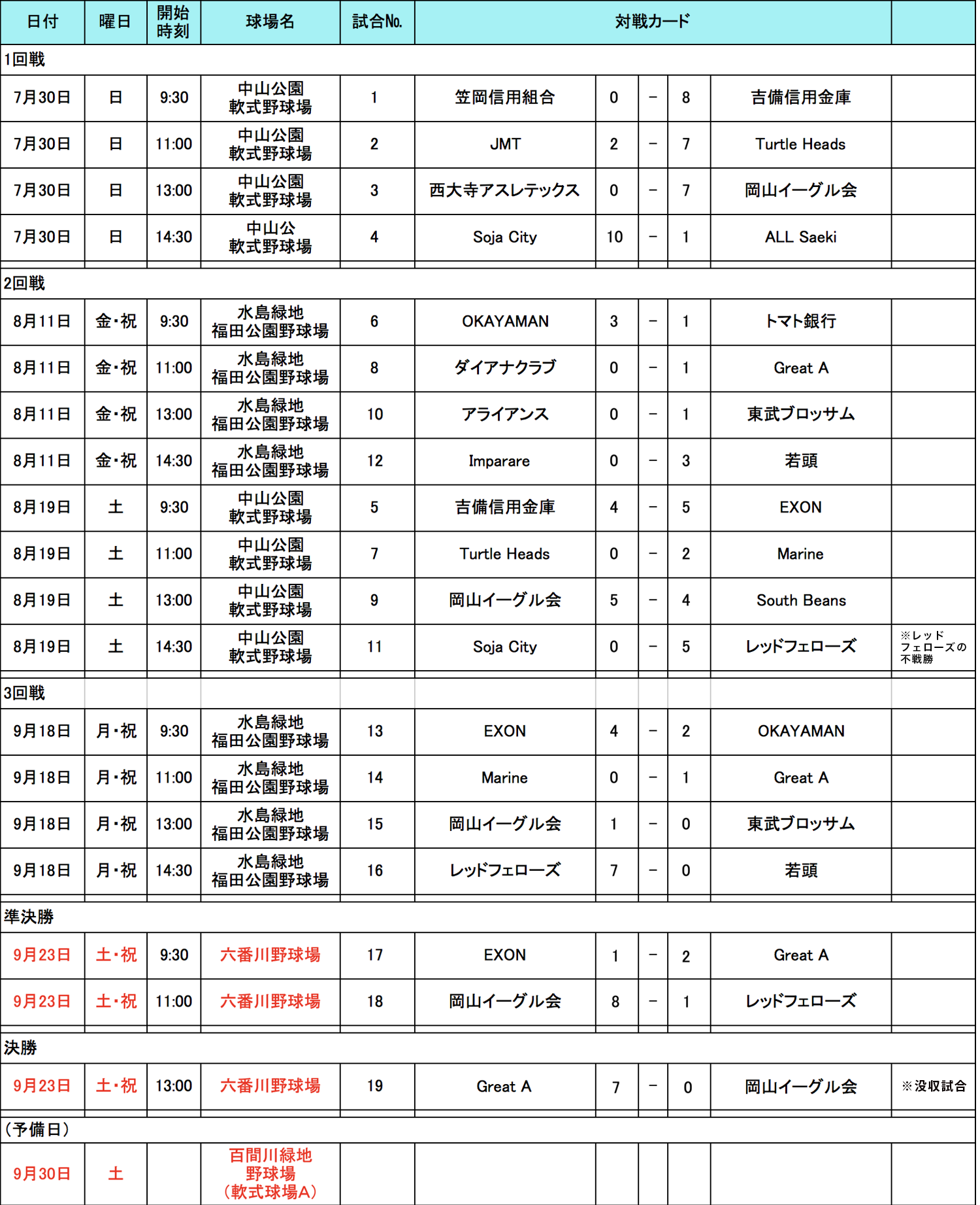 9月23日(土)に準決勝〜決勝が行われましたので結果をお知らせします。「GreatA」VS「EXON」、「レッドフェローズ」VS「岡山イーグル会」の結果、