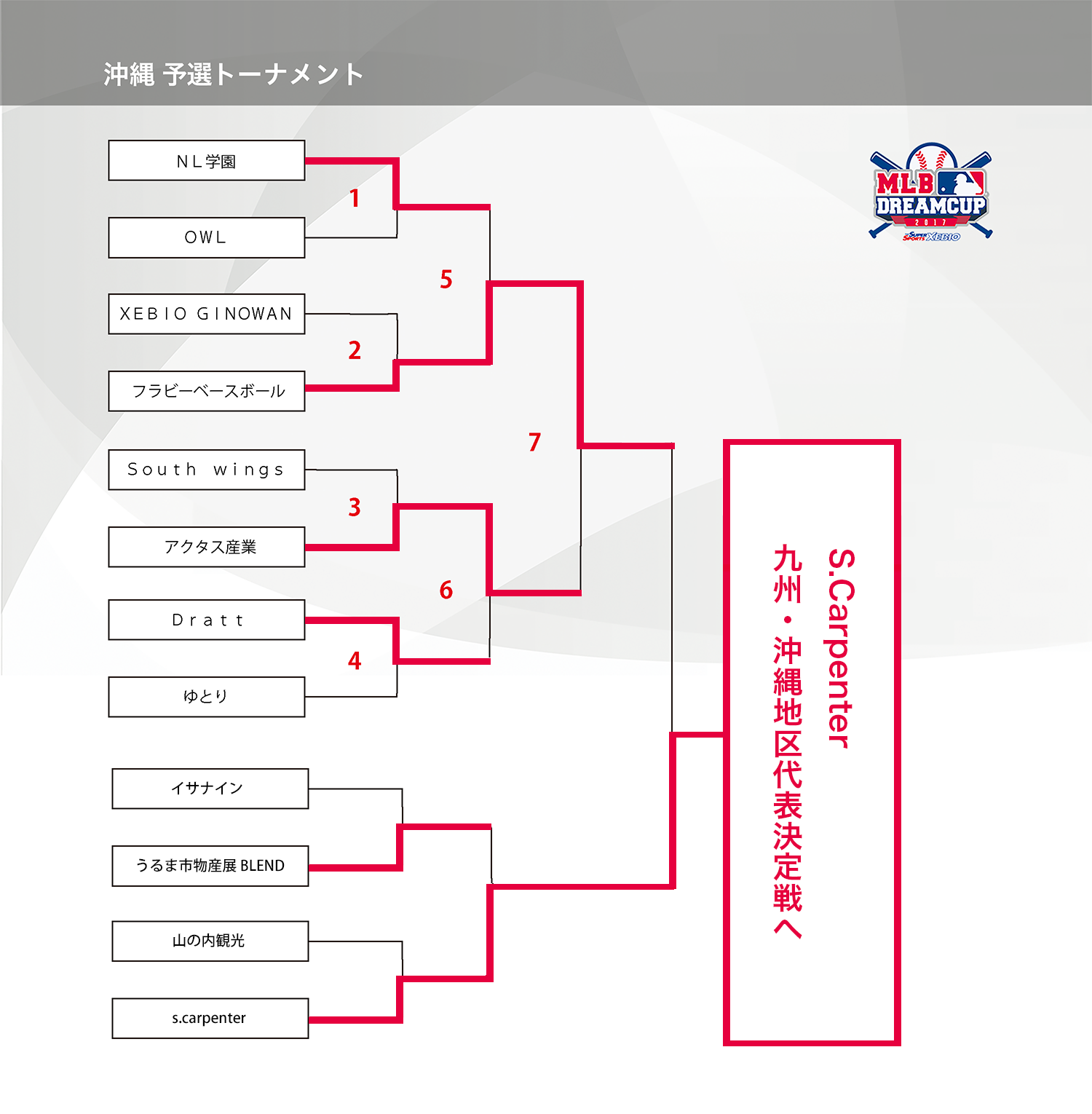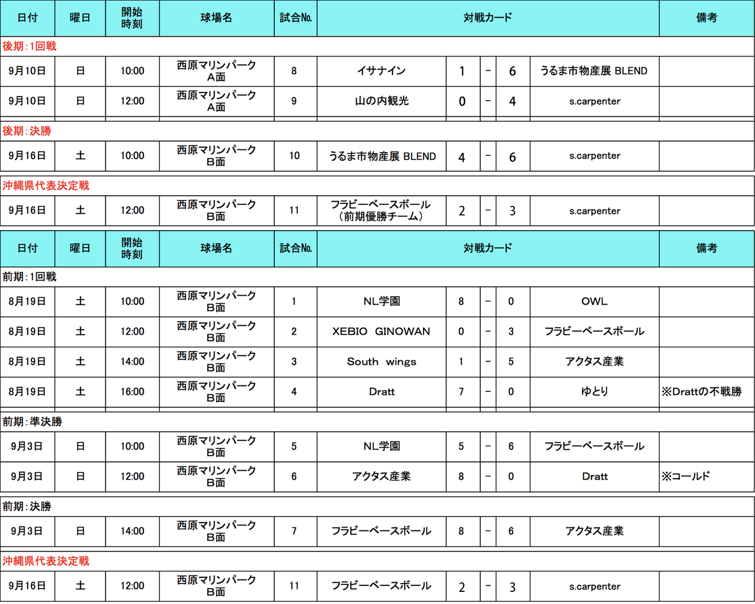 HOME > アーカイブ > アーカイブ 九州・沖縄地区 試合結果(予選) 沖縄ブロック・試合結果 2017年9月22日 沖縄県の参加者の皆様、大変お待たせ致しました。 9月16日(土)に後期決勝〜前後期合わせての決勝が行われましたので、結果をお知らせします。チャンピオンシップトーナメント、決勝大会開催ご当地の代表となったのは「S.Carpenter」!おめでとうございます。前期トップの「フラビーベースボール」も大健闘でお疲れ様でした、来年もおまちしております。 試合結果表を拡大 九州・沖縄地区の詳細の日程はこちら note -アーカイブ, 九州・沖縄地区, 試合結果(予選)