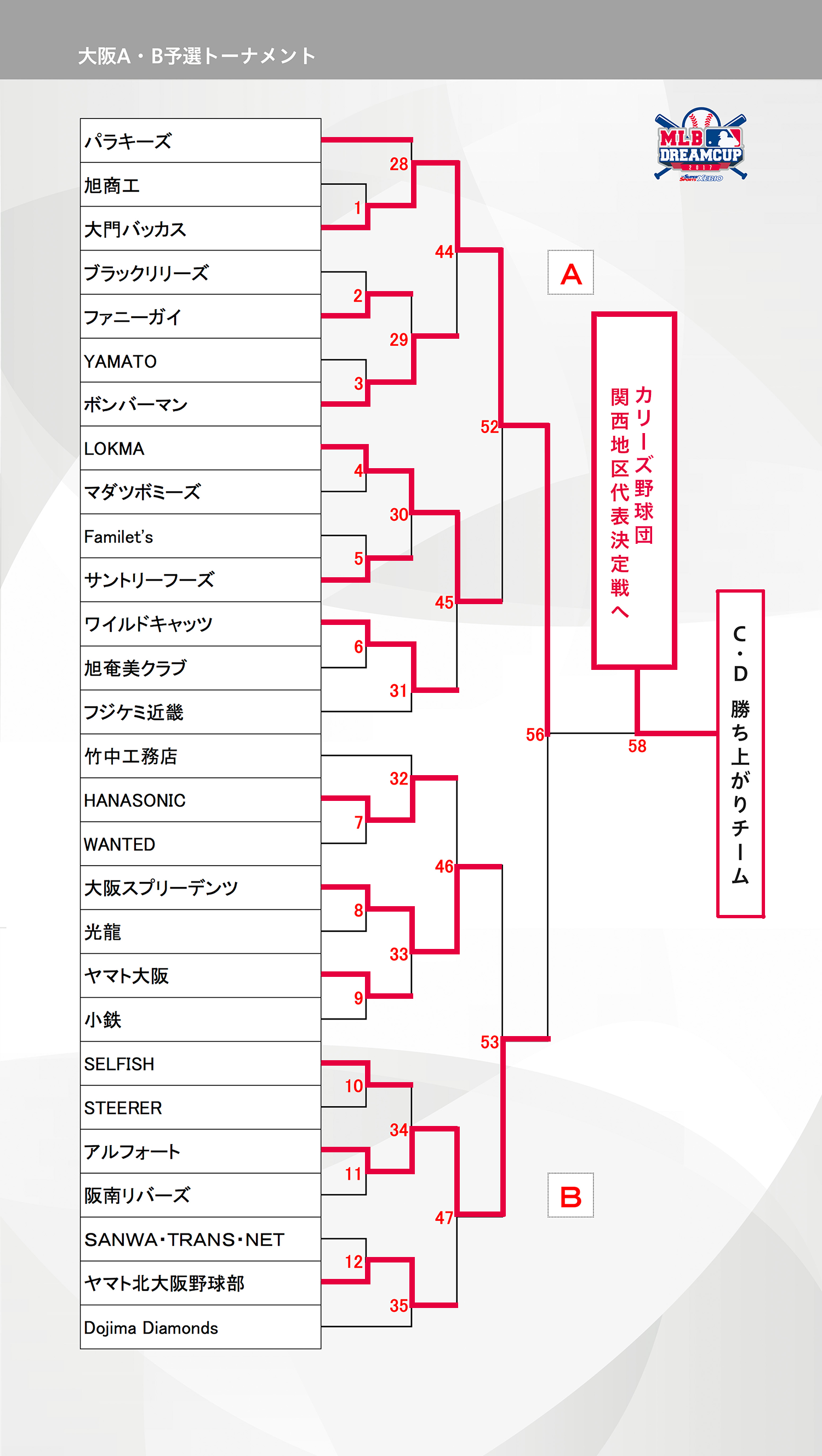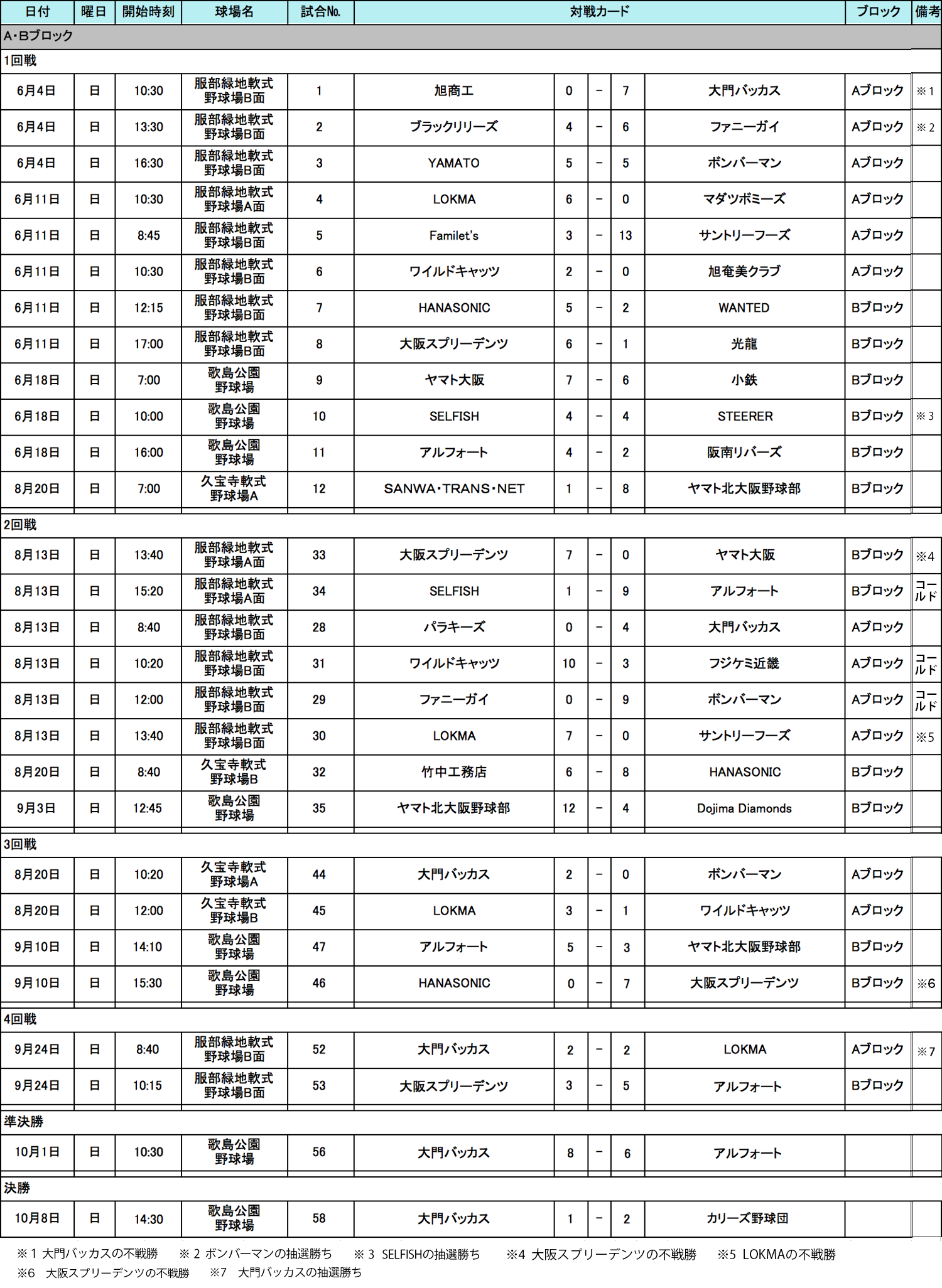 大阪府の参加者の皆様、大変お待たせ致しました。10月8日(日)の「大門バッカス」VS「カリーズ野球団」戦の結果をお知らせいたします。1-2で「カリーズ野球団」が大阪ブロック59チームの頂点に立ち、関西地区代表戦に進むこととなりました、おめでとうございます!!「大門バッカス」もこの激戦区にて準優勝の健闘をいただきました、お疲れ様でした。また来年もおまちしております。
