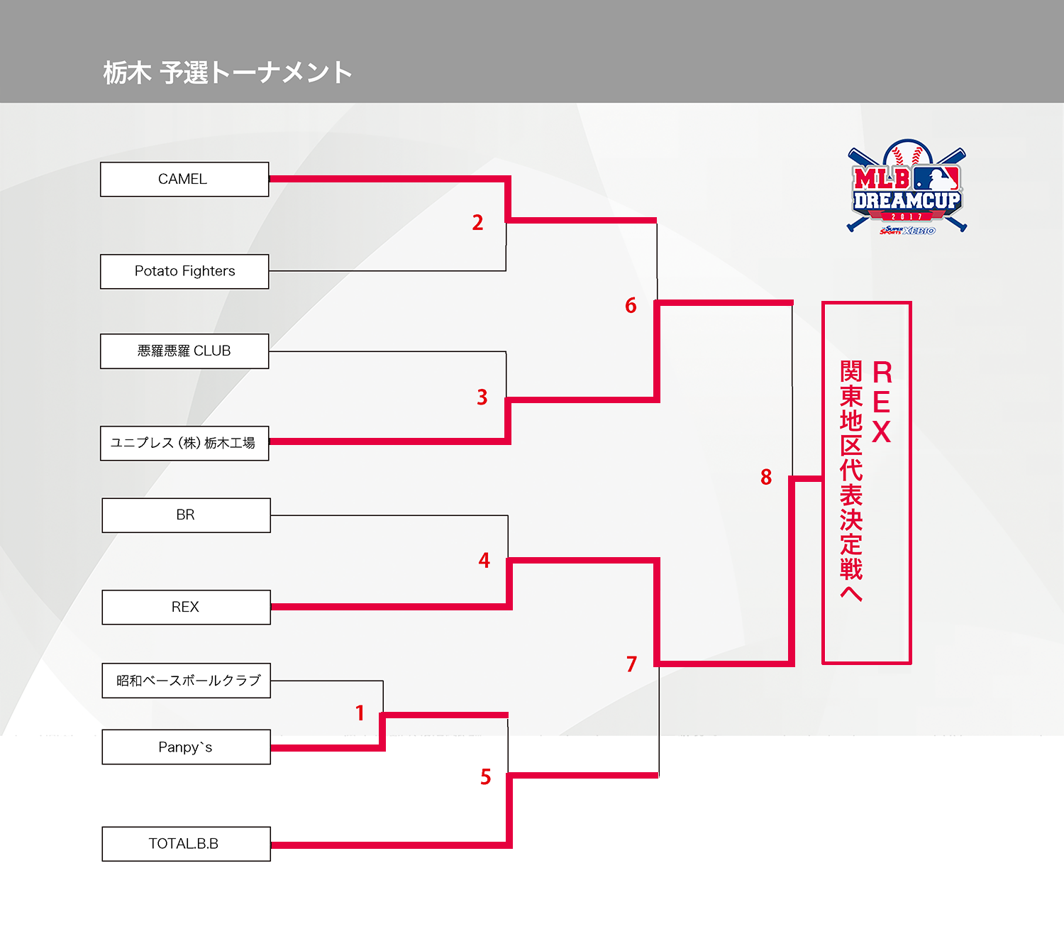 HOME > アーカイブ > アーカイブ 試合結果(予選) 関東地区 栃木ブロック・試合結果 2017年8月22日 栃木県の参加者の皆様、お待たせいたしました。8月20日(日)に準決勝〜決勝が行われましたので結果をお知らせいたします。決勝は「ユニプレス(株)栃木工場」VS「REX」で行われることとなり、見事「REX」が関東地区代表決定戦へ進むこととなりました。 市区町村大会上位進出をしている「ユニプレス(株)栃木工場」、そして準決勝まで進んだ「CAMEL」「TOTALB.B」の皆様、健闘でお疲れ様でした!!来年もおまちしております。 試合結果表を拡大 関東地区の詳細日程はこちら note -アーカイブ, 試合結果(予選), 関東地区