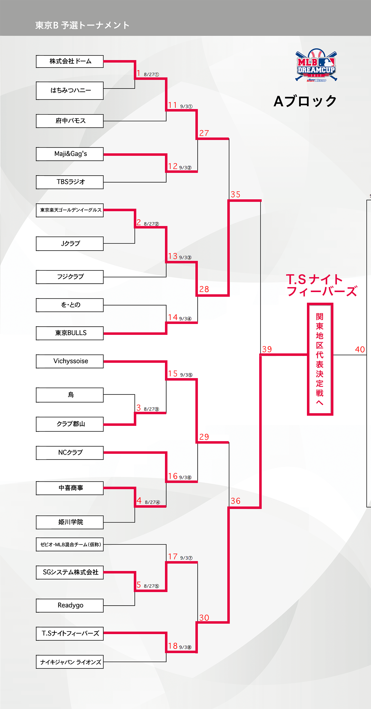 (※9月29日追記 関東代表決定戦に進出となったBブロックの「59's」は大会規約違反が発覚し、決定戦への進出を取り下げる判断をいたしました。よって「ゼビオ選抜NewYorkYankees」が関東代表決定戦へ進出となります。トーナメント表を修正しておりますので一時期取り下げをいたします。)
