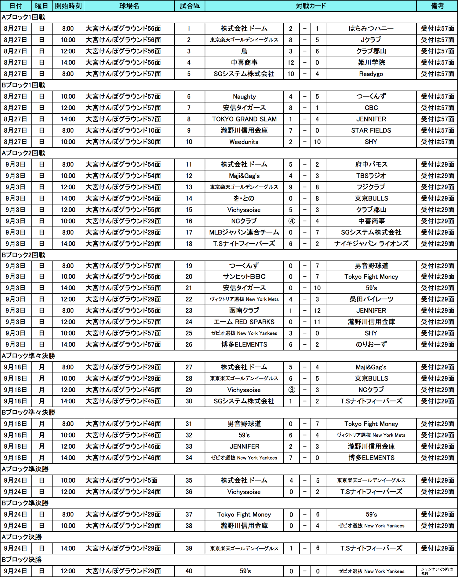 (※9月29日追記 関東代表決定戦に進出となったBブロックの「59's」は大会規約違反が発覚し、決定戦への進出を取り下げる判断をいたしました。よって「ゼビオ選抜NewYorkYankees」が関東代表決定戦へ進出となります。トーナメント表を修正しておりますので一時期取り下げをいたします。)