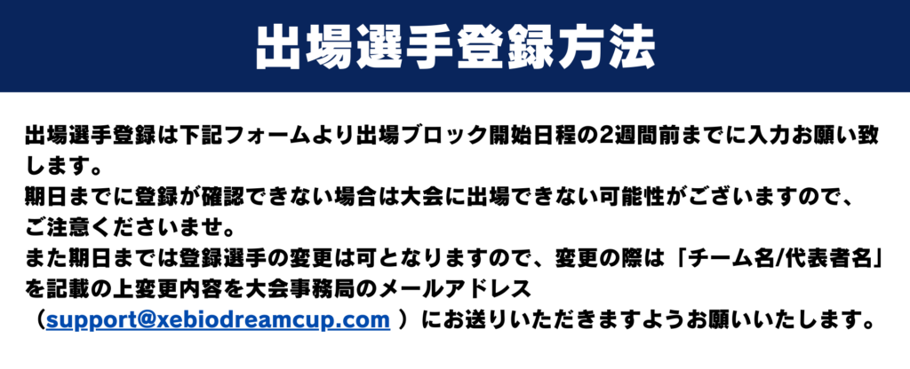 エントリー時の選手登録は不要となります。選手登録は出場ブロックの開始日の2週間前までに以下に掲載の指定フォームよりご入力をお願いいたします。