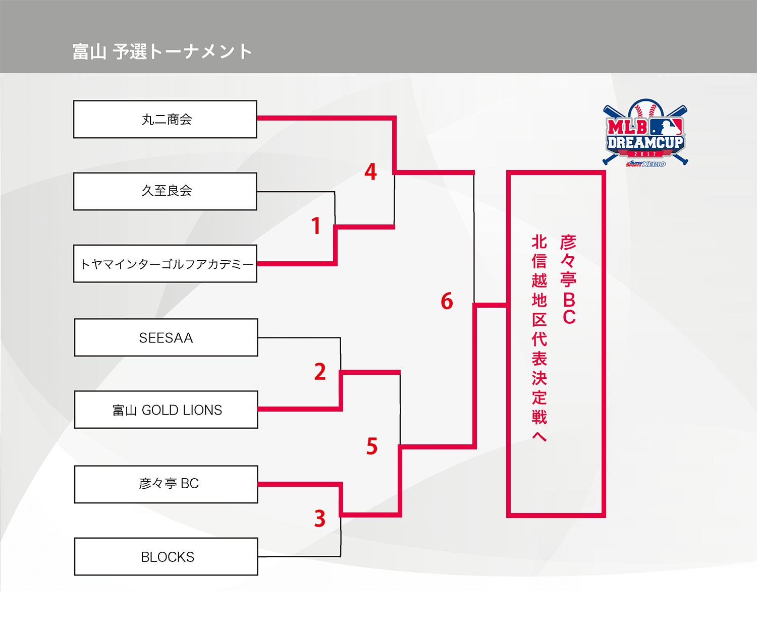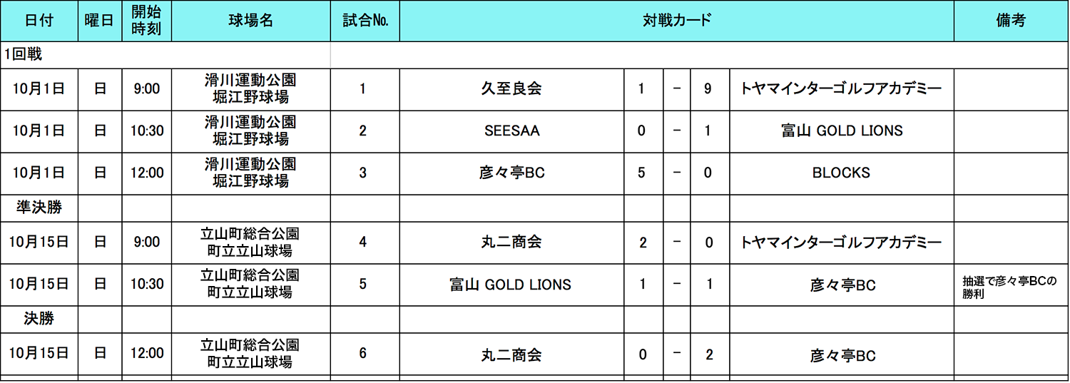 富山県の参加者の皆様、大変お待たせ致しました。 10月15日(日)の準決勝〜決勝の結果をお知らせいたします。「丸二商会」VS「トヤマインターゴルフアカデミー」、「富山GOLD LIONS」VS「彦々亭BC」戦の結果、「丸二商会」VS「彦々亭BC」で決勝戦が行われました。0-2で見事「彦々亭BC」がブロック代表となりました!!「丸二商会」も健闘を頂きお疲れ様でした、また来年もお待ちしております。